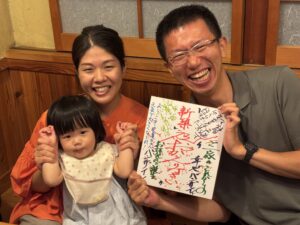 上郡に帰って来られた娘さん夫婦。お客様皆様で「お帰りなさい」 とお祝いし、色紙にコメントしました。若者達、上郡にどうぞ!
